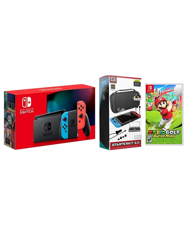 Nintendo Switch 32GB Console Neon Red/Blue Joy-Con Bundle with Surge 11-In-1 Accessory Starter Pack and Mario Golf Super Rush