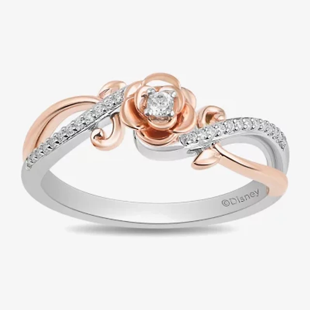 Enchanted Disney Fine Jewelry Womens 1/10 CT. T.W. Natural White Diamond 14K Rose Gold Over Silver Sterling Flower Beauty and the Beast Belle Princess Crossover Side Stone Cocktail Ring