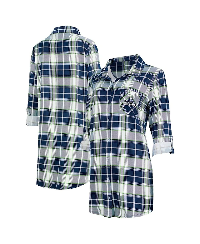Women's Concepts Sport College Navy, Neon Green Seattle Seahawks Mainstay Flannel Full-Button Long Sleeve Nightshirt