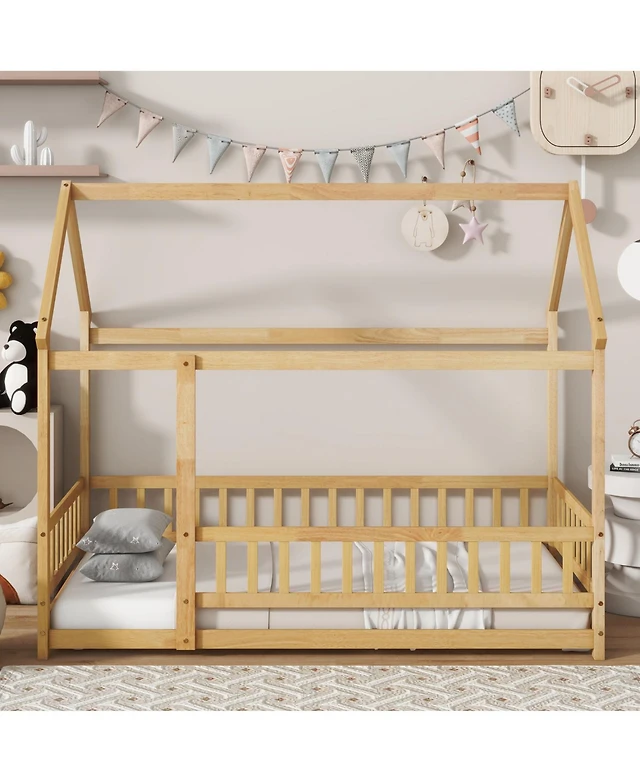 Gouun Twin Size Kids Montessori Floor Bed with Lockable Door and Fence Guardrails