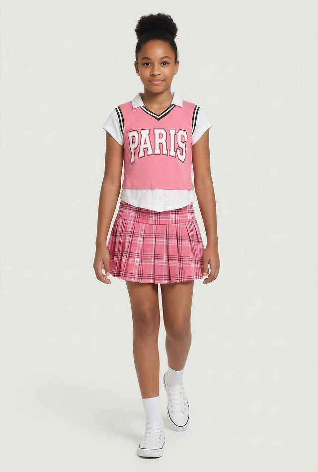 Plaid Mini Pleated Skirt with Contrast Waistband