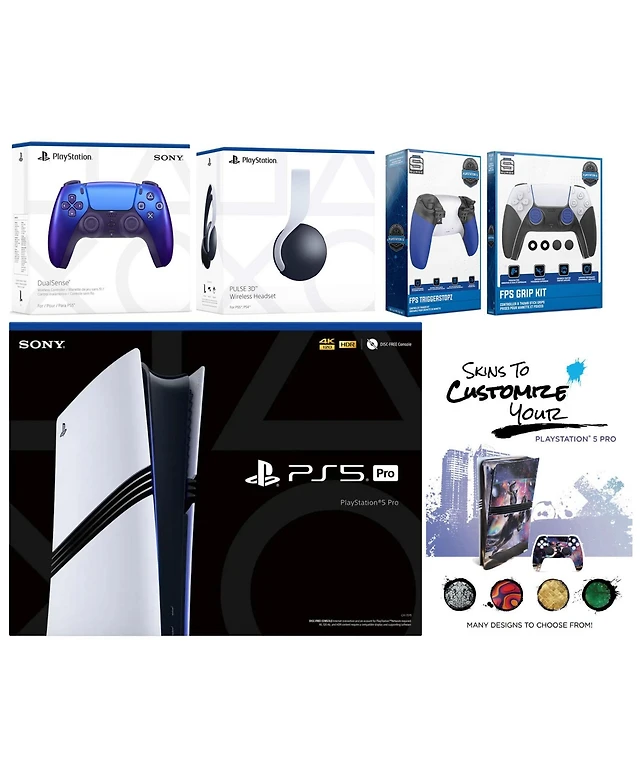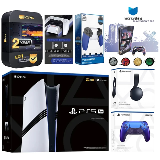Sony Playstation 5 Pro Bundle with White Pulse Headset, Extra Galactic Purple Controller, Trigger Stop Kit, Dual Charge Dock and MightySkins Decal Vou