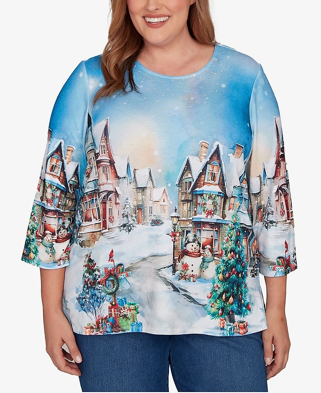 Alfred Dunner Plus Classic Embellished Snow Cabin Village Scene Crew Neck Top