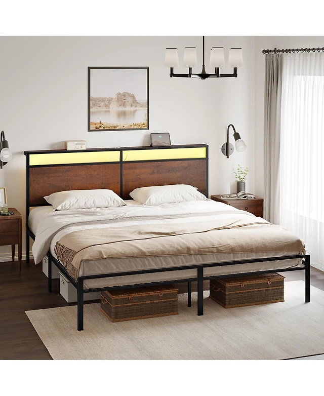 gaomon Full Size Bed With Storage Headboard, Charging Station And Led Lights, Upholstered Platform Bed Frame With Metal Slats, Noise Free, No Box Spri