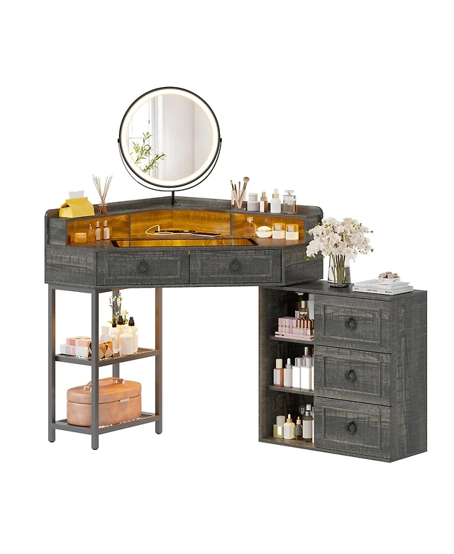 gaomon Corner Makeup Vanity Desk With Lights, Power Outlet, And Rotating Drawers-3 Color Lighting, Adjustable Brightness, Shelves, Stool