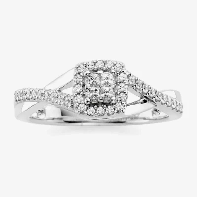 Before your engagement, declare your love with this quad promise ring set in 10K White Gold. Split bypass shanks hug a center of four princess-cut genuine diamonds framed by a cushion halo, creating just the right amount of sparkle that shines as brightly as your love.