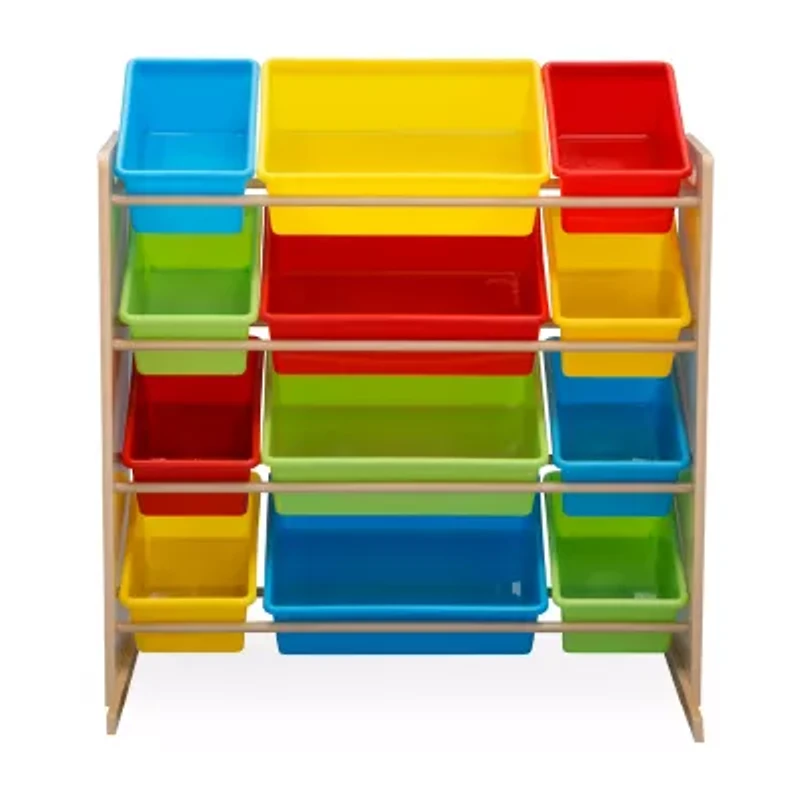 Store and organize toys, books, art supplies, dress-up clothes and more with our kids toy storage organizer. This storage unit features 12 sturdy bins in two sizes and will help organize any room in your house.