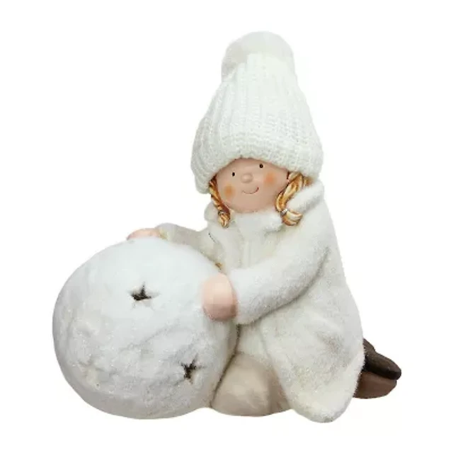 12.5'' White Tealight Snowball with Kneeling Girl Christmas Candle Holder