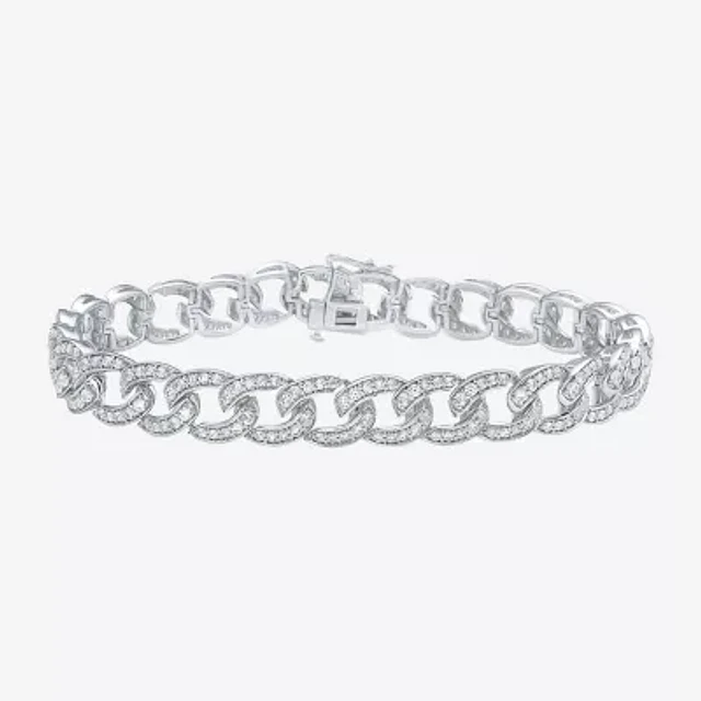 Men's Sterling Silver White Gold Plated with Iced Out Cubic Zirconia Oblong Curb Chain Bracelet