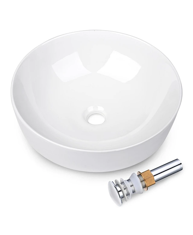 16" Round Porcelain Ceramic Bathroom Countertop Vessel Sink w/Pop up Drain Hotel