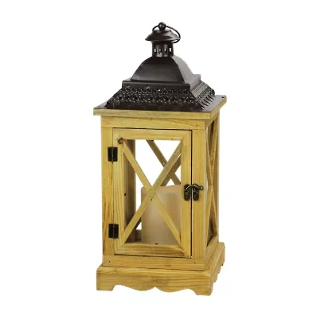 17.5'' Rustic Wooden Lantern with Brown Metal Top and LED Flameless Pillar Candle with Timer
