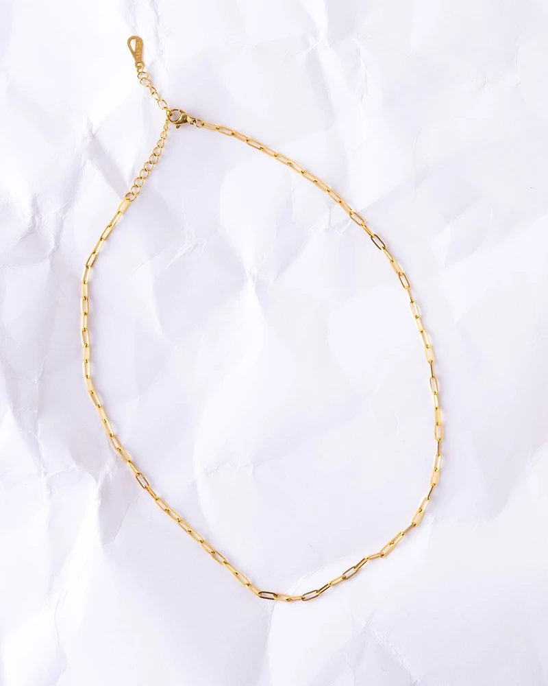 Sleek and effortlessly cool, this 18K gold-plated necklace features delicate paper clip links that shines with understated confidence. Perfect worn solo or layered up, it’s an everyday essential that adds instant polish to any look.