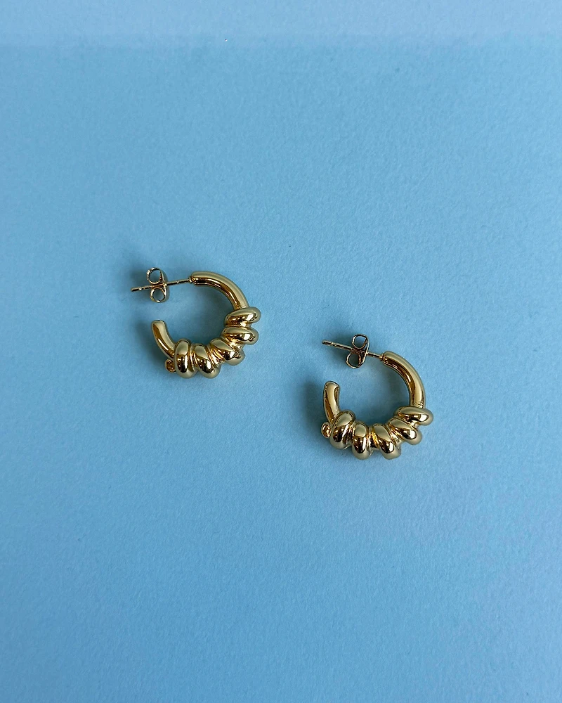 These 18K gold-plated hoops feature a chunky, coiled design that adds instant attitude and shine to any look. Bold yet playful, they’re perfect for elevating everyday outfits or adding a cool-girl twist to night-out styling.  Details Hoop Earrings Push Backing Vine Coiled Hoops Content + Care 18K Gold Plated Stainless Steel While most of our gold plated pieces have a water-resistant coating to keep up with your everyday moments, we recommend removing them during intense activities and cleaning with a soft cloth weekly to keep them in good condition.