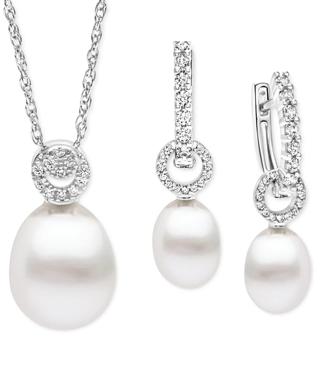 2-Pc. Set Cultured Freshwater Pearl (9-10mm) & White Zircon (1-3/8 ct. t.w.) Pendant Necklace & Drop Earrings in Sterling Silver