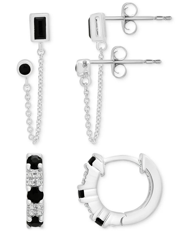 2-Pc. Set Onyx & White Topaz Double Pierced Chain Earrings, & Small Huggie Hoop Earrings in Sterling Silver