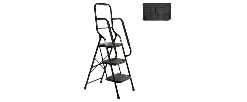 Ensure safe stable access with this 3 step folding ladder featuring a 500 lb capacity side handrails a tool bag and a space saving design for versatile home or kitchen use