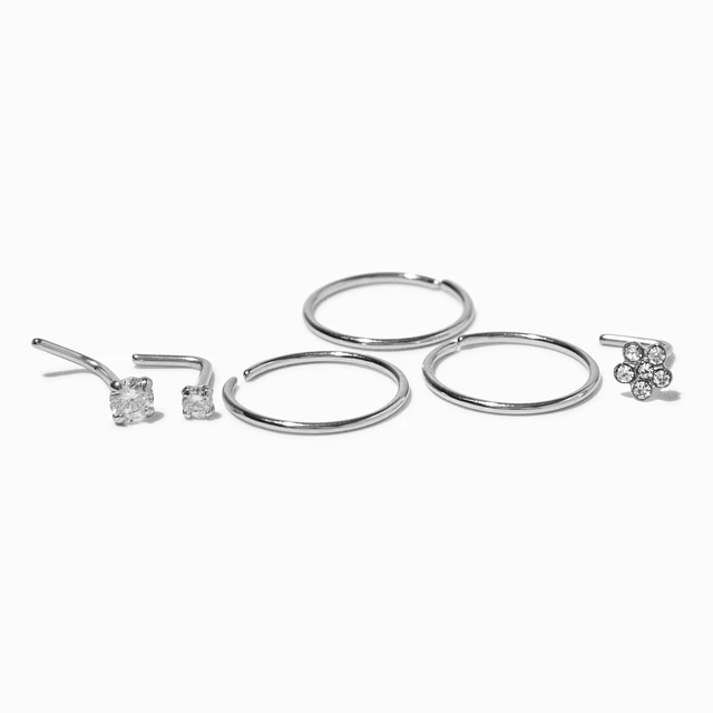 18G Silver-tone Stainless Steel Cubic Zirconia Basic Stud & Hoop Nose Rings - 6 Pack