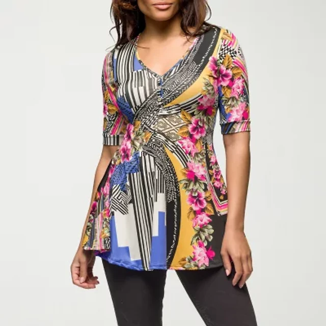 24seven Comfort Apparel Plus Womens V Neck Elbow Sleeve Tunic Top