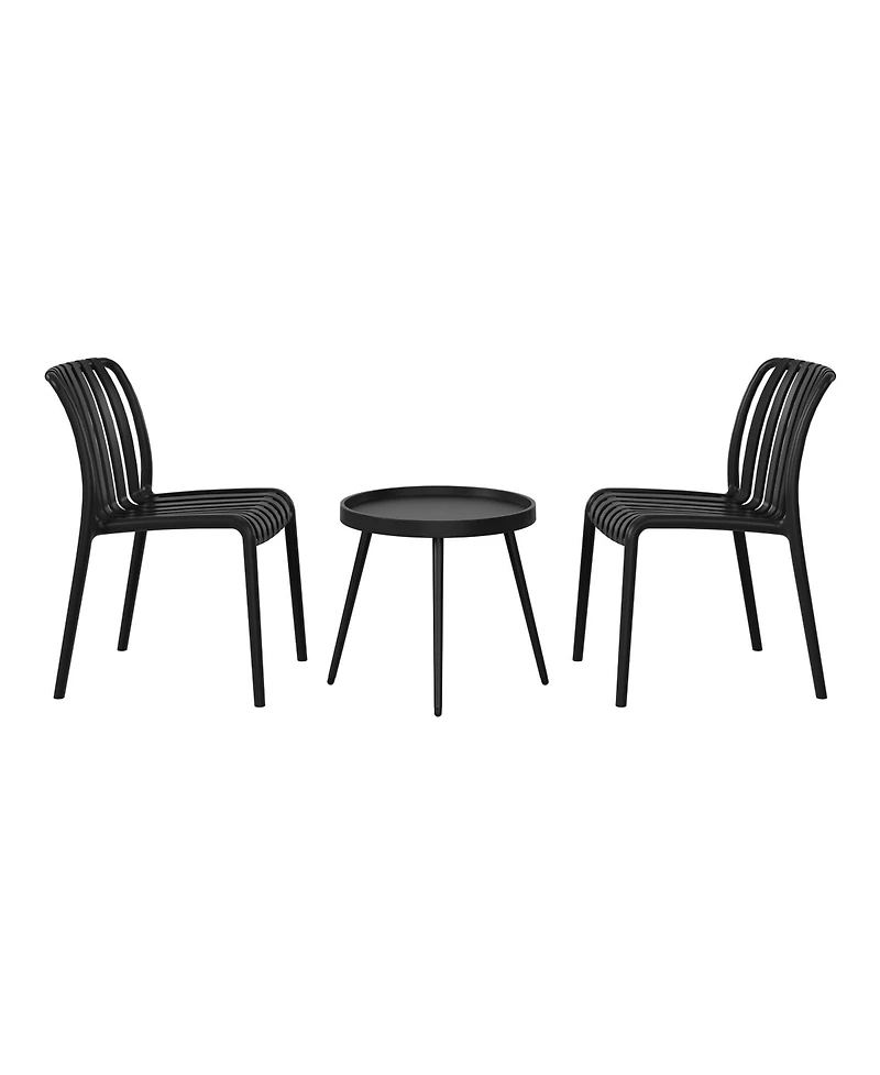 Elevate your patio with this contemporary 3-piece dining set, designed for both form and function. The 18.5" round side table features a sleek polypropylene top and is grounded by an iron frame with durable, rust-resistant e-coating to ensure added protection against the outdoors. Adjustable leveling feet on the table ensure stability on any surface, while its raised edges help contain spills and prevent water from dripping onto your floors or carpet for easier cleanup. Complementing the table are two stackable patio chairs crafted from Uv- and fade-resistant polypropylene resin. Their slatted design promotes airflow, keeping you comfortable on warm days, and allows water to drain, preventing puddling on the seat. Rubber foot pads on the chairs protect your floors while adding stability. The clean lines and vibrant hues of this set bring a touch of modern sophistication to your outdoor space, making this the perfect balcony furniture set for apartments.