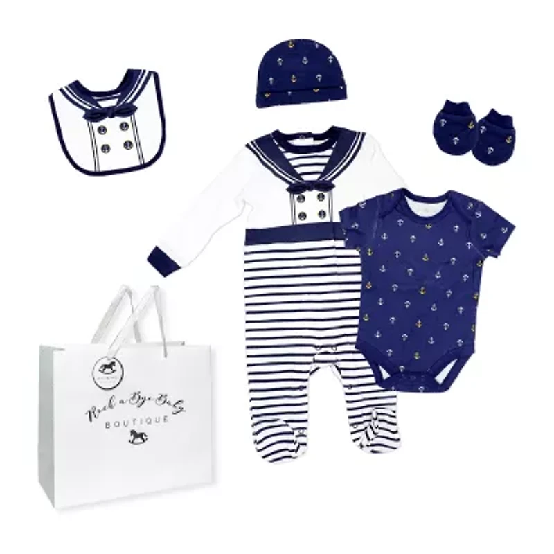 This infant apparel collection makes the perfect shower gift. The 5 piece cotton layette set includes a footie sleeper, bodysuit, bib, beanie and anti-scratch mittens in an organza bag and gift bag. Footie sleeper, beanie, bib and mitts feature navy sailor motif and bodysuit is blue anchor print. Quality construction and great value.