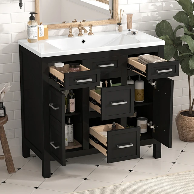 36" Black Bathroom Vanity with Sink, Mdf Cabinet with Doors & Drawers