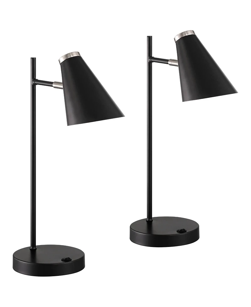 From the 360 Lighting brand, these lamps are the easy way to add modern function and style to your decor. Each lamp has two built-in Usb charge ports in the base so that you can easily charge phones and other devices. The pair of lamps have cone-profile shades and a mixed metals finish in black with brushed nickel finish accents. The lamp heads are adjustable so you can turn the light and aim it as needed.