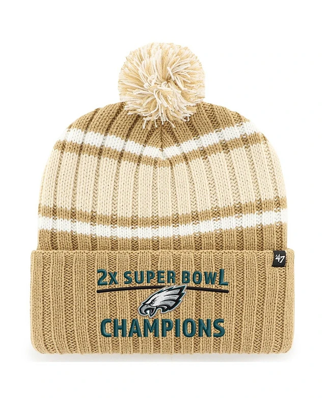 '47 Brand Men's Khaki Philadelphia Eagles Two-Time Super Bowl Champions Plateau Cuffed with Pom Knit Hat