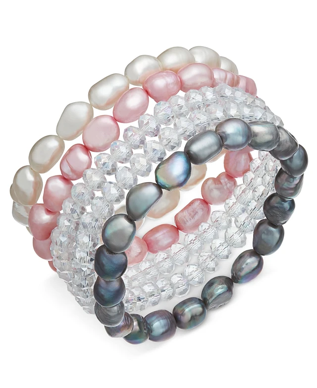 5-Pc. Set White, Pink & Gray Cultured Freshwater Baroque Pearl (7mm) and Rondel Crystal Stretch Bracelets