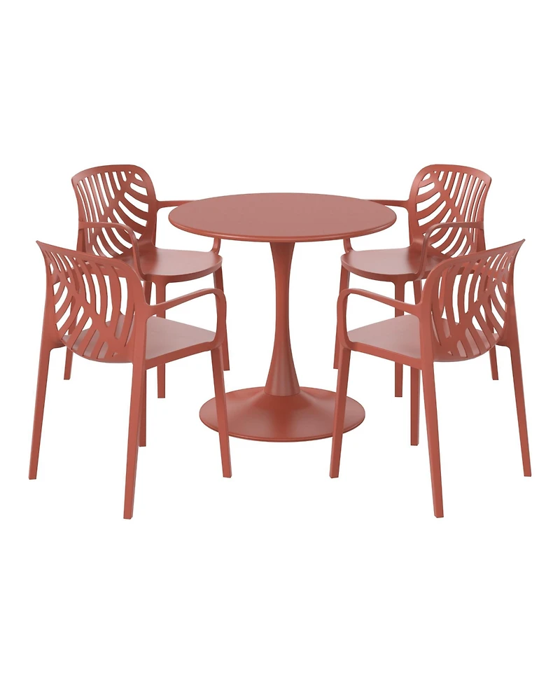 Elevate your outdoor gatherings with this four-person dining set. The round metal bistro table features a rust-resistant e-coating and a wide flat base for added stability. Four stackable, lightweight, Uv-resistant polypropylene chairs offer easy rearranging and space-saving convenience. Their palm-leaf, ventilated, contoured backrests enhance airflow, comfort, and style. The chairs arrive fully assembled, and the table sets up quickly, making this 5-piece set a perfect patio upgrade for the season.