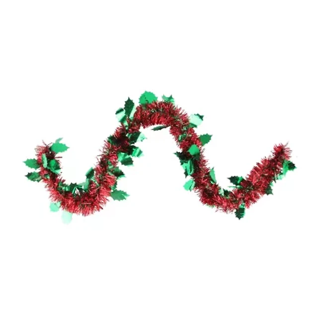 50' Shiny Red Christmas Tinsel Garland with Green Holly - Unlit