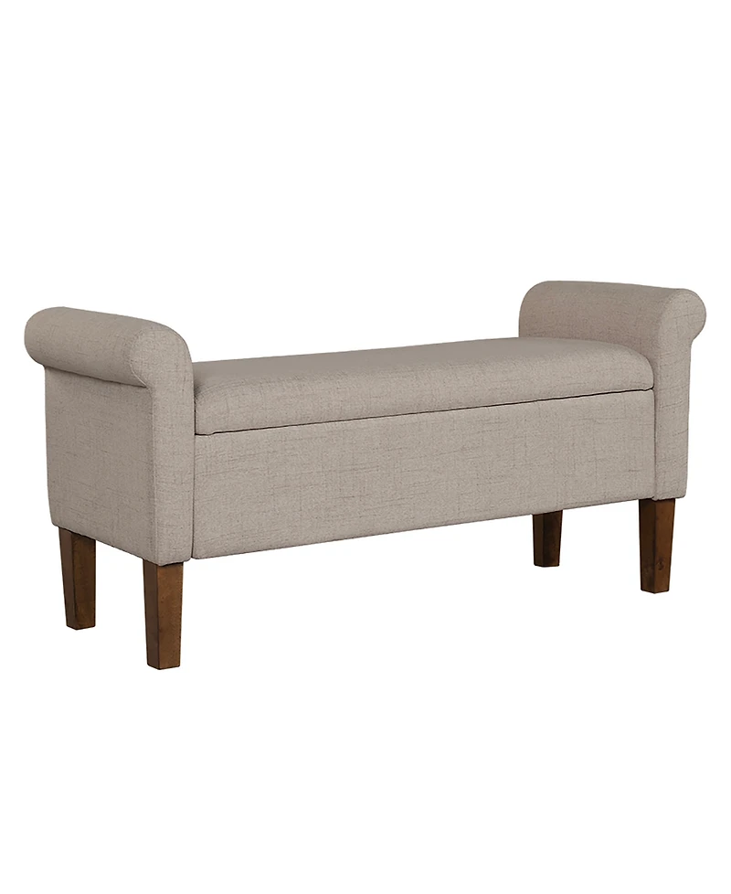 Upgrade your space with the Aubrey Storage Bench. Fully upholstered, it boasts rolled armrests and ample storage under the flip-top seat. Crafted with solid wood legs in medium walnut finish, it's perfect for any room. Assembly is easy.