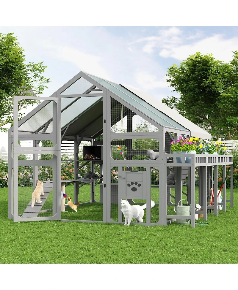 Give your cats the ultimate outdoor haven with this Large Outdoor Cat House with Planter Stand, designed to meet both your pets needs and your garden s style. Crafted from solid pine and sturdy metal, this walk-in cat enclosure features a versatile side stand for holding flower pots and storing garden tools, adjustable to either side for a perfect patio fit. The multi-level activity center keeps your cats entertained with 8 spacious platforms, 2 ladders, a hanging bridge, a high-durability scratching post, and 2 cozy cat houses-offering ample opportunity for climbing, playing, and relaxing in the fresh air. Two private enclosed resting boxes provide shade and comfort for naps. Cleaning and feeding are hassle-free thanks to a split door design and sliding tunnel door, while the fully covered, weather-resistant roof ensures year-round protection and a bright, comfortable environment for multiple cats.