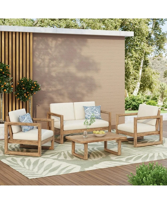 Gouun 4-Piece Acacia Wood Outdoor Furniture Set with Cushioned Chairs and Coffee Table