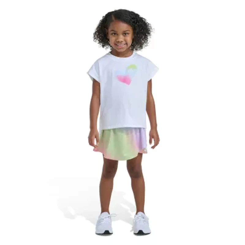 This adidas little girl's two-piece set will keep her comfortable and free to be active or have fun with her friends. It includes a soft cotton-knit graphic t-shirt with short sleeves and a crew neck, plus a flowy rainbow skort with built-in shorts.