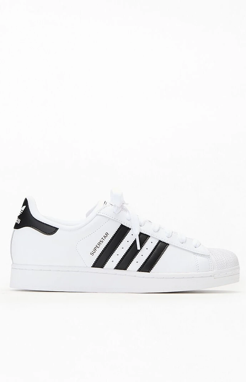 Step into legendary sport and street style with White & Black Superstar II Shoes from adidas. These shoes feature a smooth leather upper and rubber shell toe, a padded tongue and collar for all day comfort while the textured rubber outsole provides grip. This product be returned to a Happy Returns bar location and can only be returned in-store or by mail. This supersedes all other Pacsun return policies.