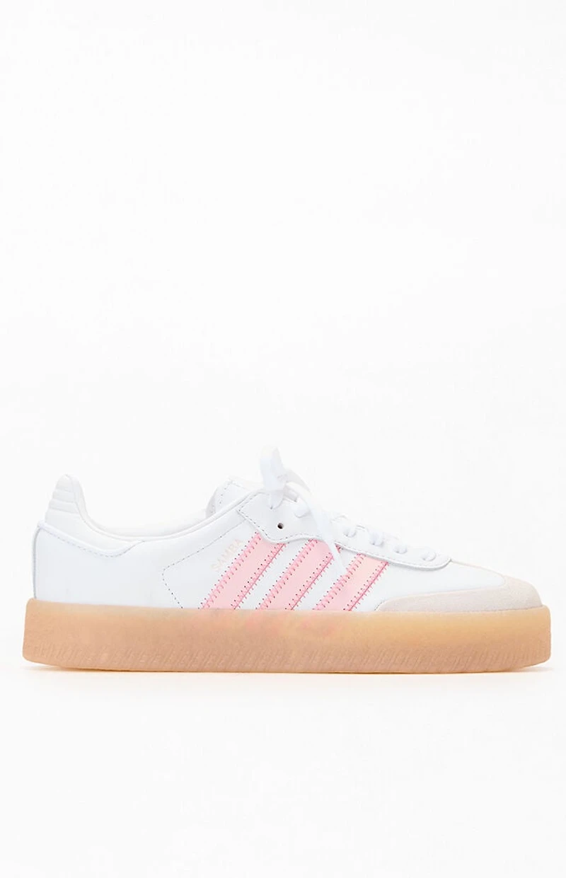 The Women's White & Pink Samba Sneakers from adidas bring classic style to your everyday rotation. Designed with a smooth leather upper, synthetic lining, durable rubber outsole, and contrasting 3-Stripes, these Samba shoes blend all-day comfort with timeless street-ready style.