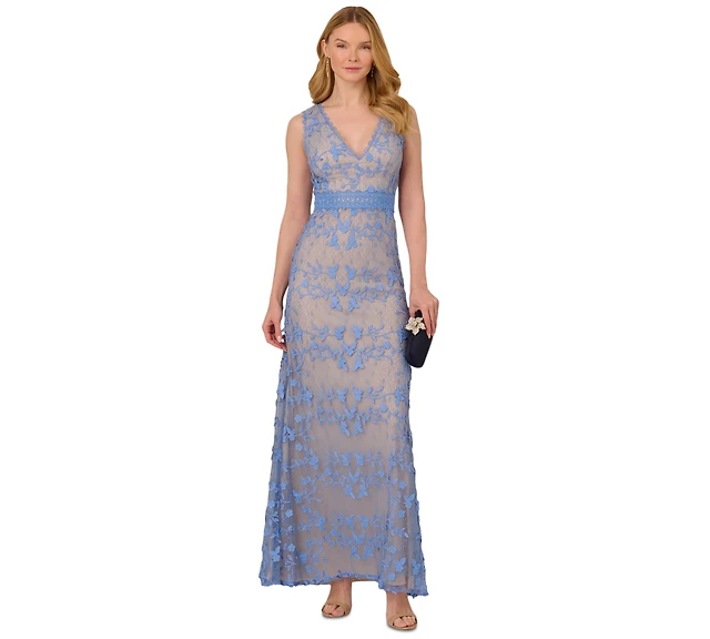 Adrianna Papell Women's Embroidered V-Neck Lace Gown