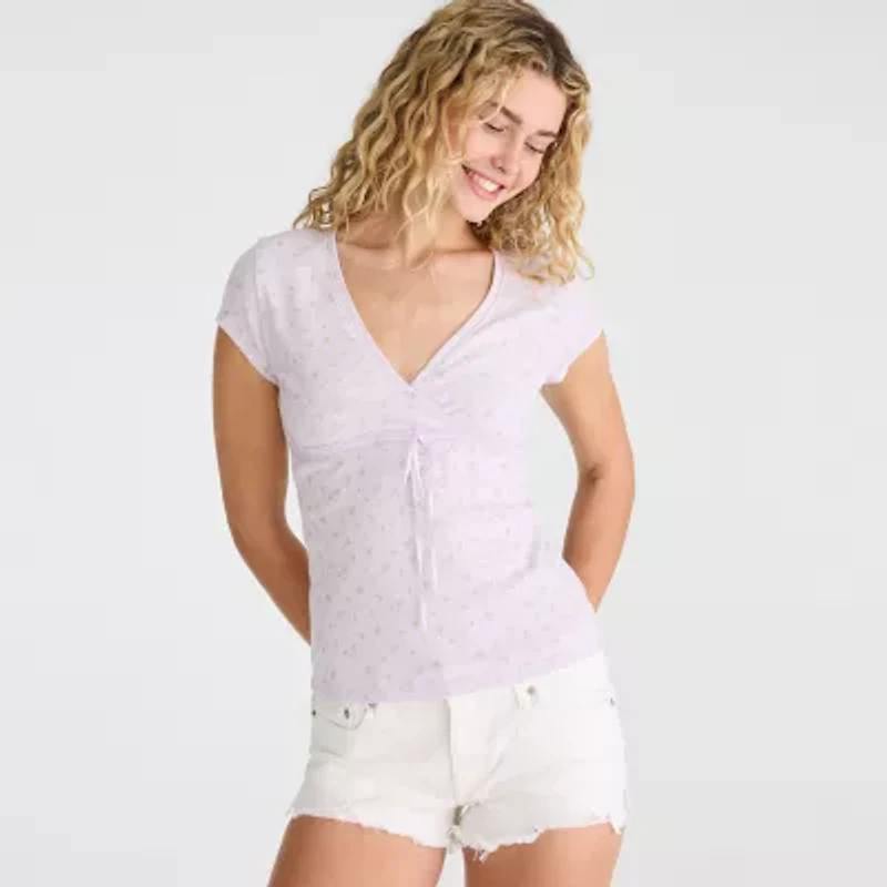 This AEROPOSTALE women's and junior's t-shirt is made from 100% cotton for a lightweight feel. It has a close-fit with a wrap v-neckline and a lace trim with a bow for a feminine touch. Wear it with jeans or shorts.