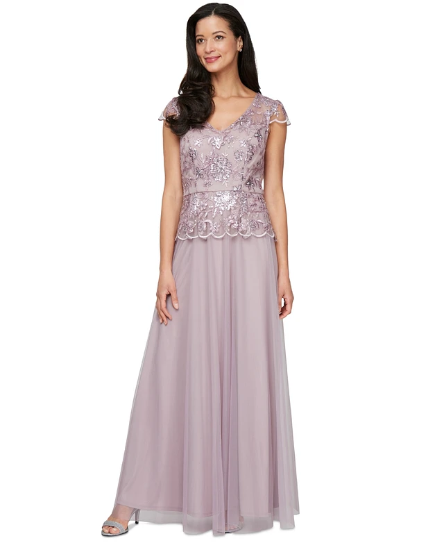 Alex Evenings Women's V-Neck Cap-Sleeve Embroidered Gown
