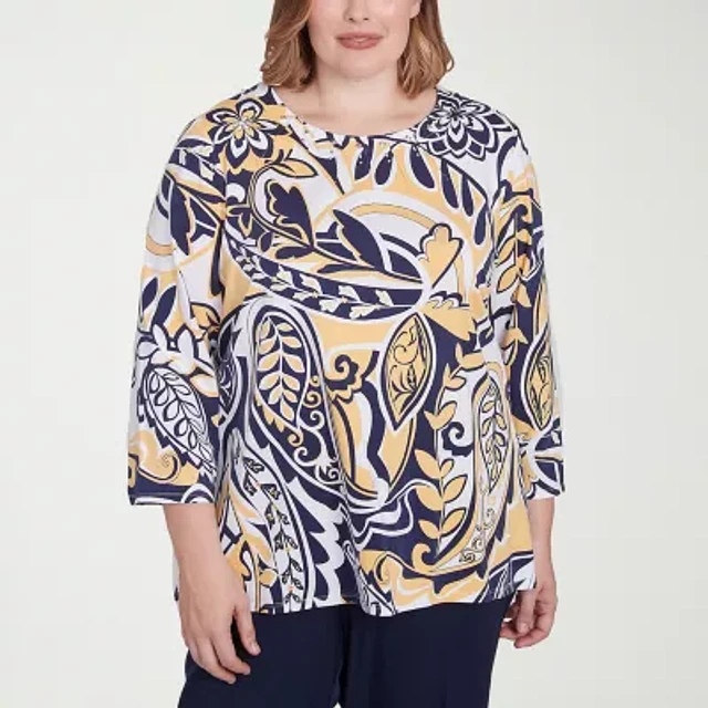 Alfred Dunner Block Island Womens Crew Neck 3/4 Sleeve Plus T-Shirt