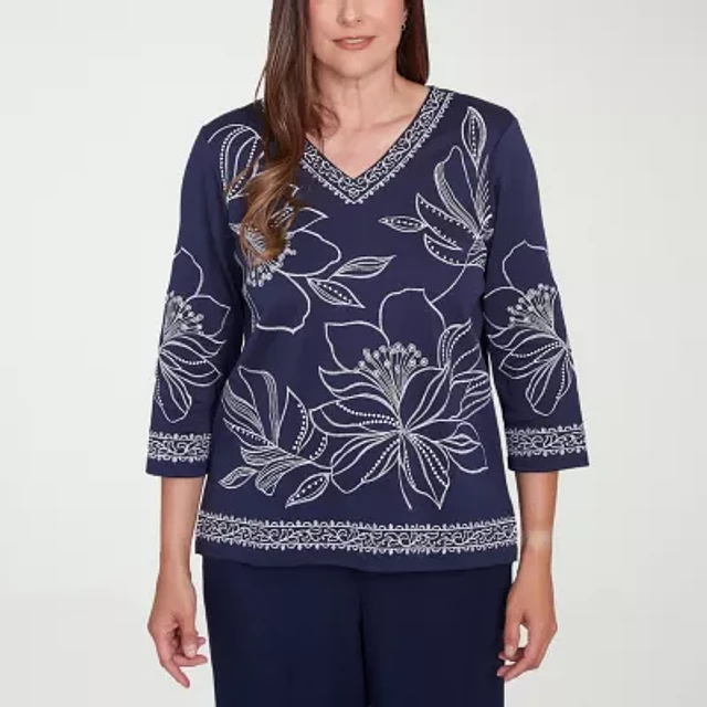 Alfred Dunner Block Island Womens V Neck 3/4 Sleeve T-Shirt