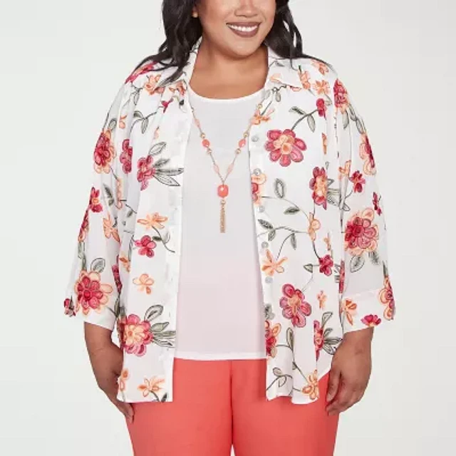 Alfred Dunner Catalina Island Womens 3/4 Sleeve Embroidered Plus Layered Top
