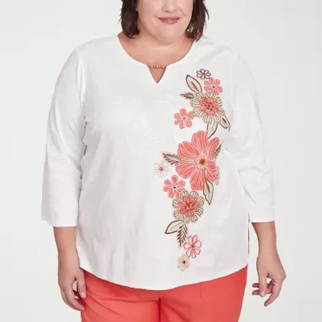 Alfred Dunner Catalina Island Womens Split Crew Neck 3/4 Sleeve Plus T-Shirt