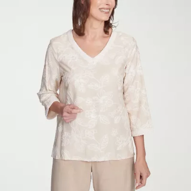 Alfred Dunner Catalina Island Womens V Neck 3/4 Sleeve Embroidered Blouse