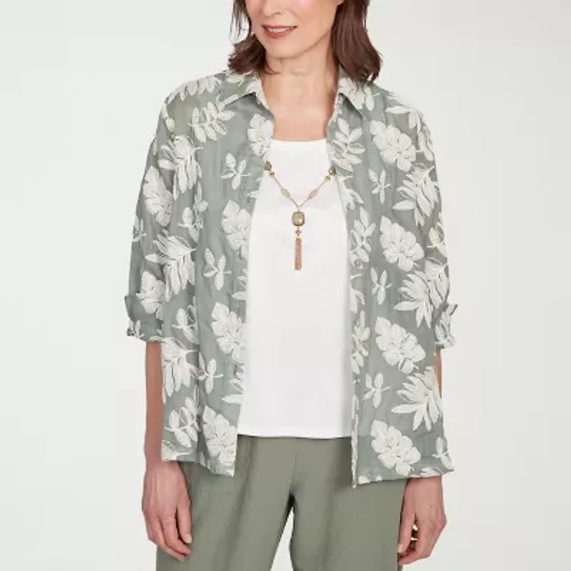 Alfred Dunner Catalina Island Womens 3/4 Sleeve Embroidered Plus Layered Top