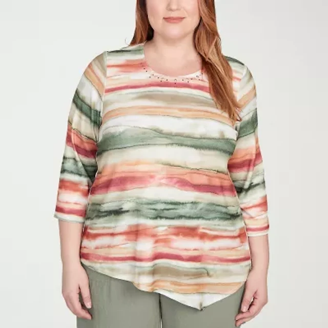 Alfred Dunner Crystal Springs Womens Crew Neck 3/4 Sleeve Plus T-Shirt