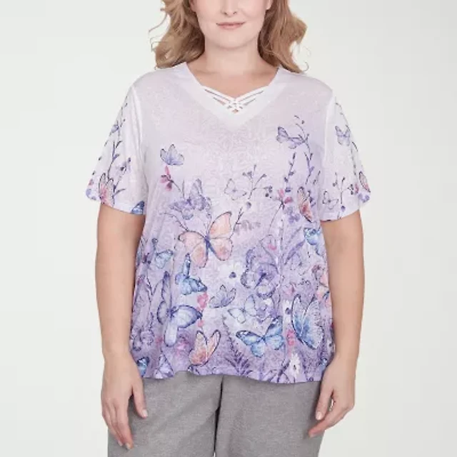 Alfred Dunner Crystal Springs Womens V Neck Short Sleeve Plus T-Shirt