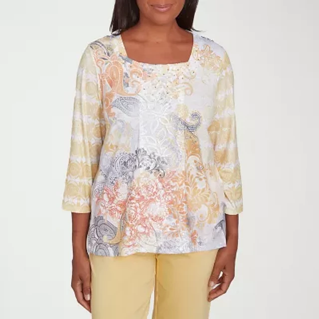 Alfred Dunner Crystal Springs Womens Square Neck 3/4 Sleeve T-Shirt