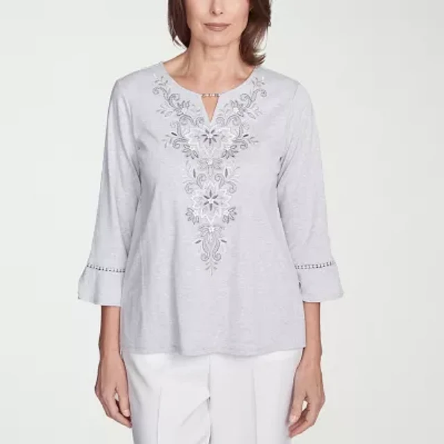 Alfred Dunner Estate Of Mind Womens Split Crew Neck 3/4 Sleeve T-Shirt