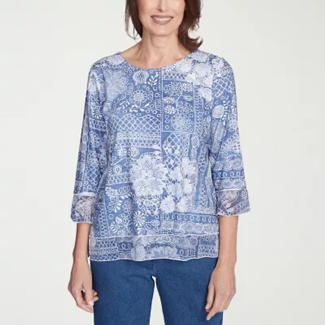 Alfred Dunner Summer Solstice Womens Crew Neck 3/4 Sleeve Stretch Fabric T-Shirt